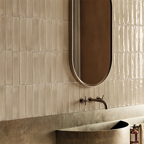 With its slim 2 x 10 format and glossy finish, the Essential Brick Sabbia Glossy Brick offers subtle movement and light reflection, making it a perfect wall accent when paired with soft-gold fixtures.