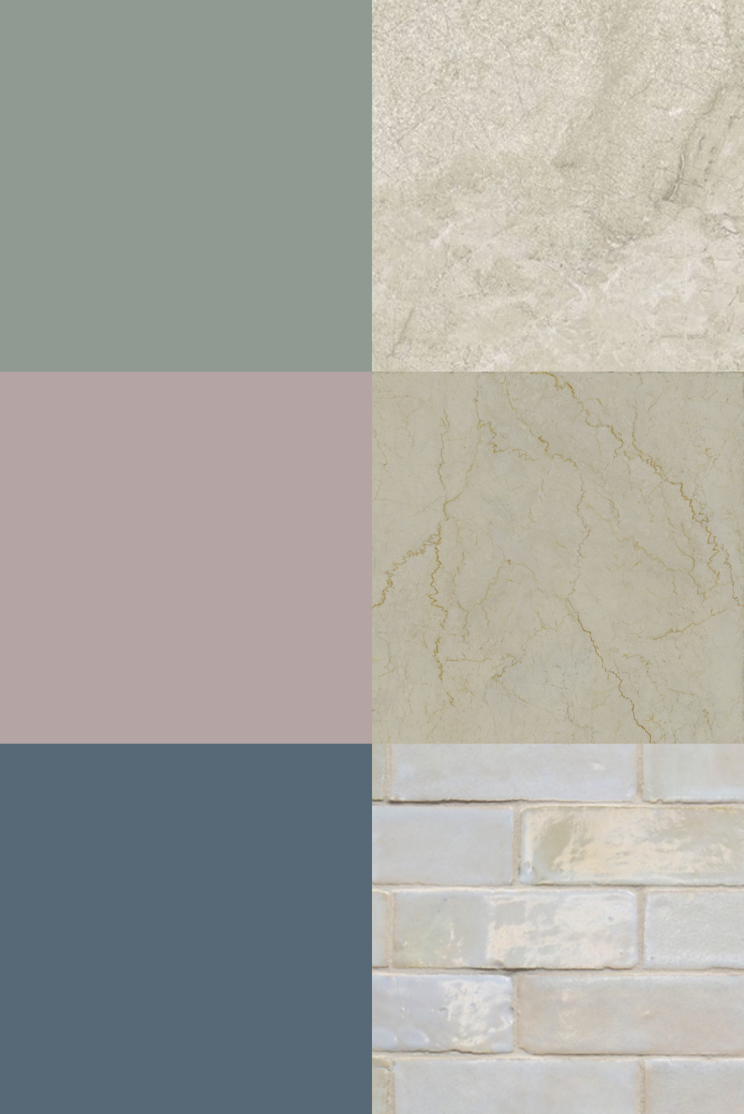 For instant spa energy, pair soft eucalyptus green alongside River Beige Soft 16x32. Warm blush tones elevate the soft veining in Marmorea Botticino Matte 12x12, and muted storm blue gives a fresh and balanced contrast to handcrafted textures like Zin Fog Glossy 2x6 Bejmat.
